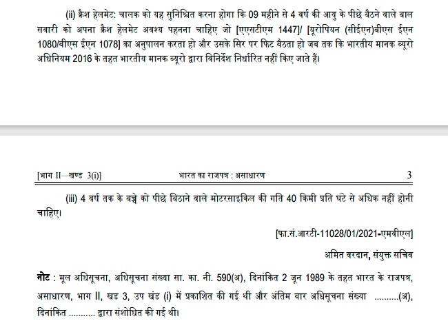 प्रस्ताव में कहा गया है कि 9 महीने से लेकर 4 साल की उम्र तक का बच्चा अगर पीछे बैठा है तो वह क्रैश हेलमेट पहना हो। यही नहीं, चार साल से कम उम्र के बच्चे को मोटरसाइकिल के चालक से जोड़ने के लिए सेफ्टी हार्नेस का इस्तेमाल करना होगा। सेफ्टी हार्नेस की मदद से बच्चे का ऊपरी धड़ चालक से सुरक्षित रूप से जुड़ा होगा।