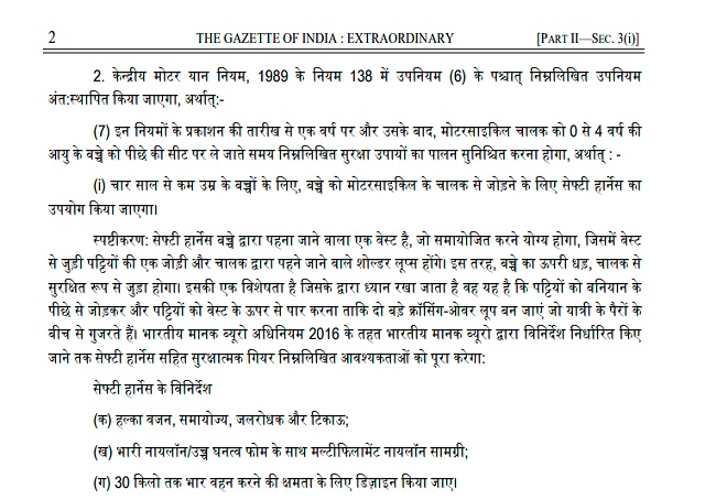 ड्राफ्ट नोटिफिकेश ने कहा कि इस तरह से सेफ्टी हार्नेस के जरिए बच्चे के शरीर का ऊपरी हिस्सा सेफ तरीके से ड्राइवर से चिप जाएगा. साथ ही ये भी कहा गया कि सेफ्टी हार्नेस कम वजन यानी लाइट वेट होना, एडजस्टेबल, वाटरप्रूफ, टिकाऊ और तीस किलो तक का वजन उठा सके ऐसा डिजाइन किया जाना चाहिए.